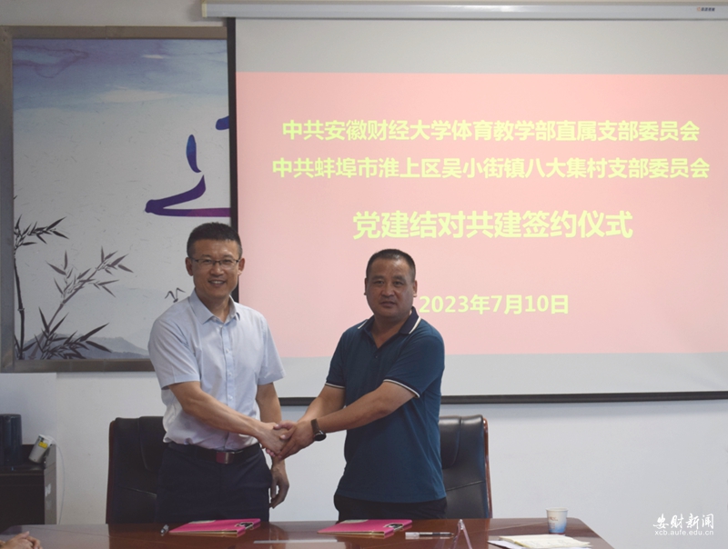 近日,体育教学部直属党支部与淮上区吴小街镇八大集村党支部结对共建签约仪式在吴小街镇政府举行。体育教学部主任、直属党支部书记姜同仁,淮上区吴小街镇党委书记李小飞,党委副书记、镇长屈伟,副镇长郭强以及八大集村党支部书记朱玉五等参加仪式。